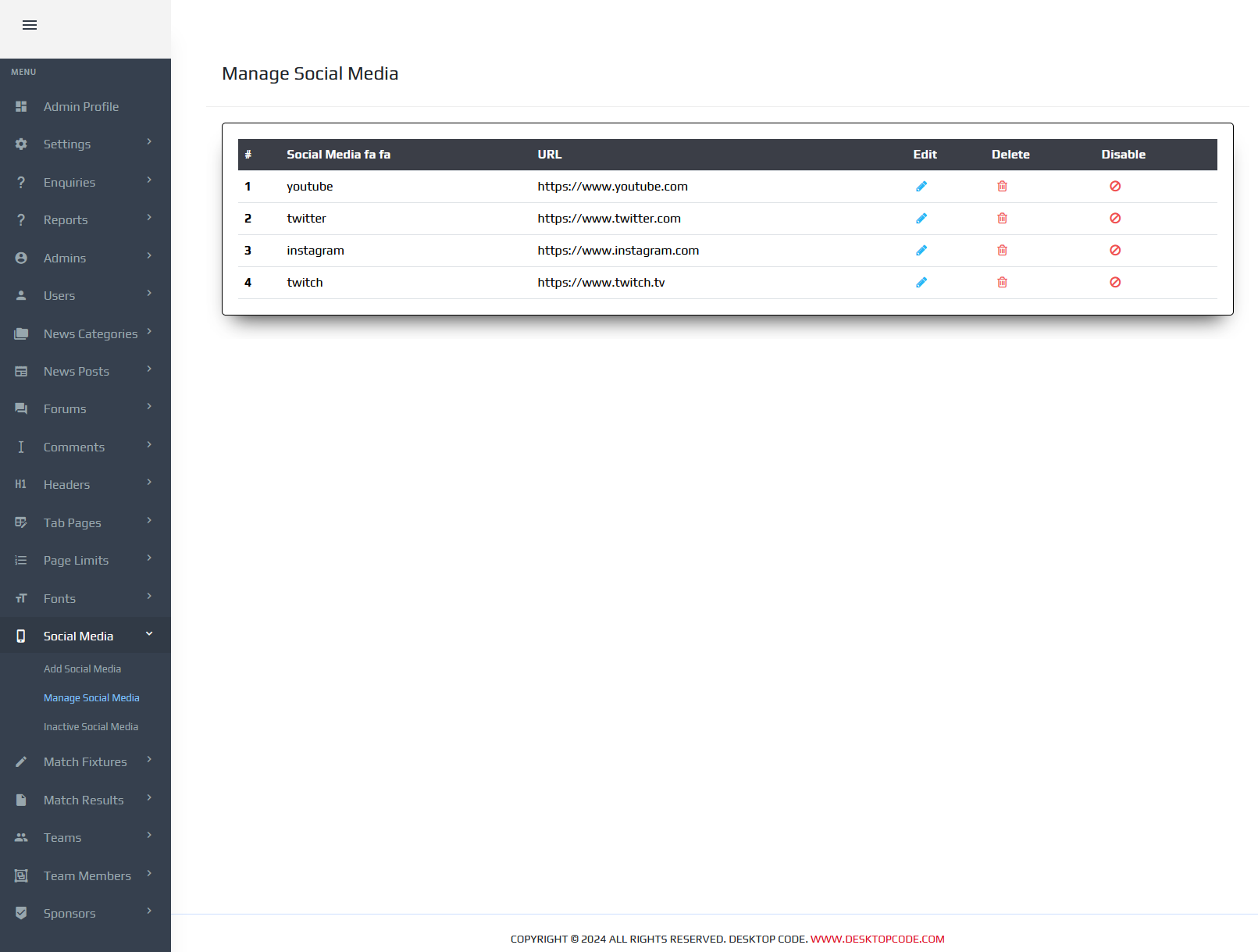 Social Media: Add, Edit and Delete a variety of different social media websites.