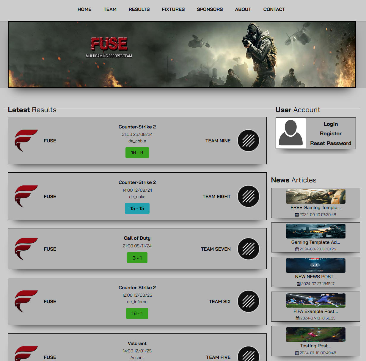 Home Page: The Home pages shows recent results and fixtures, aswell as recently posted news.