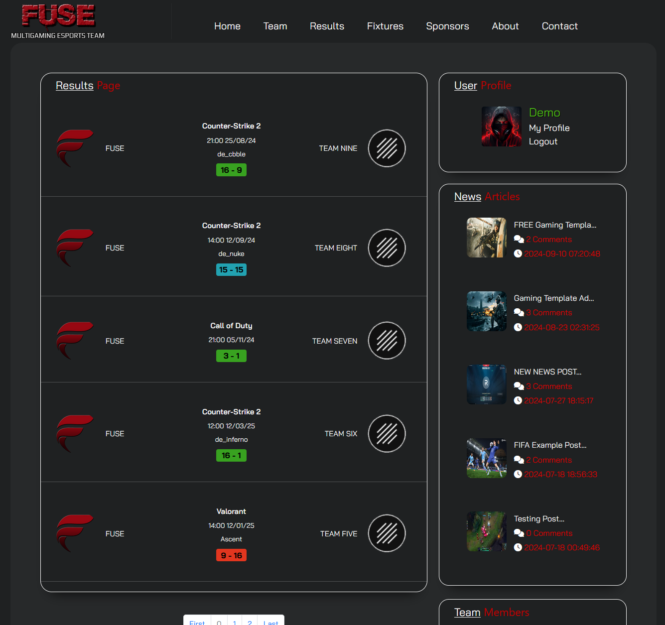 Home Page: The Home pages shows recent results and fixtures, aswell as recently posted news.